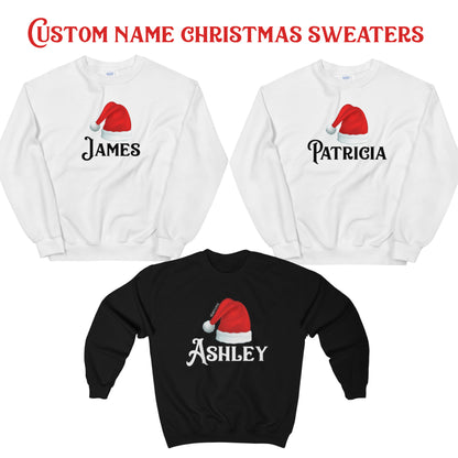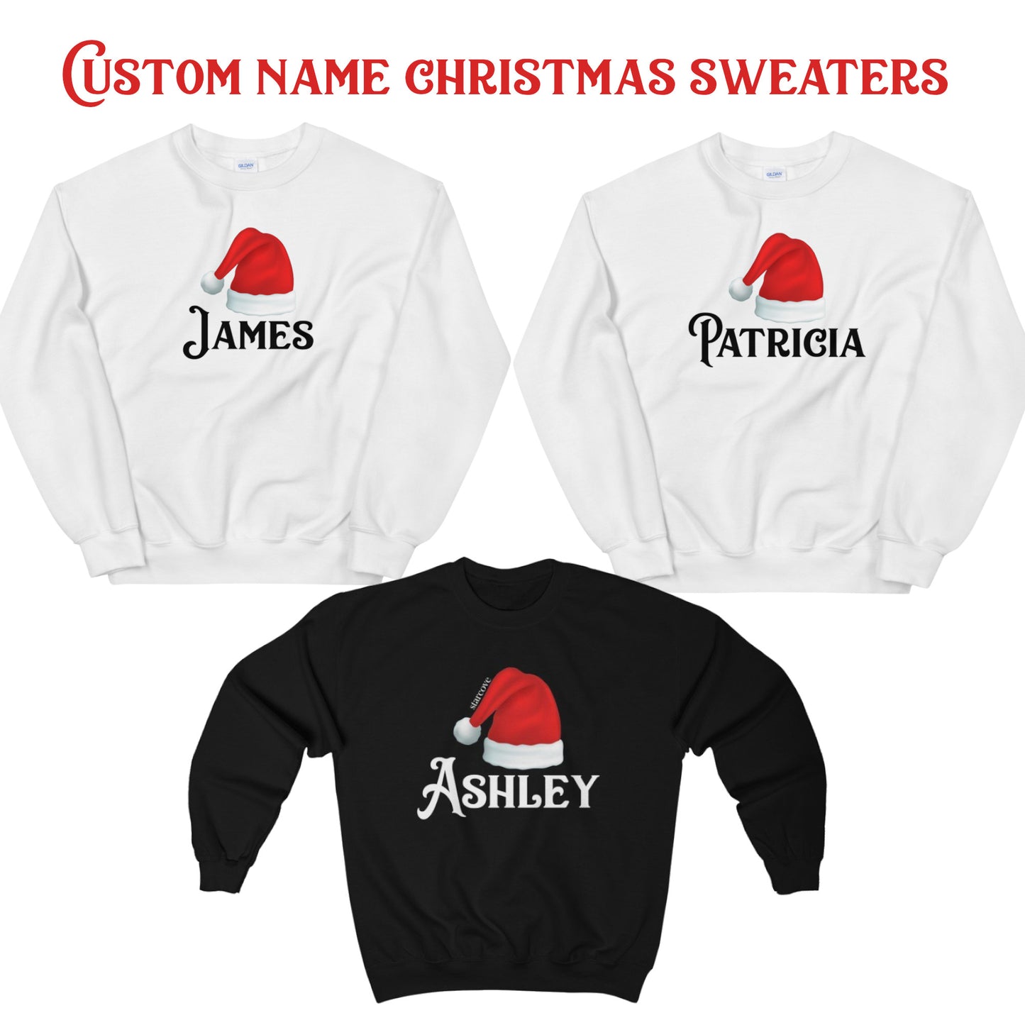 Personalized Christmas Sweaters, Custom Name Family Matching Youth Kids Women Men Couple Xmas Sweatshirt Tshirt Baby Outfits Gift Santa Hat