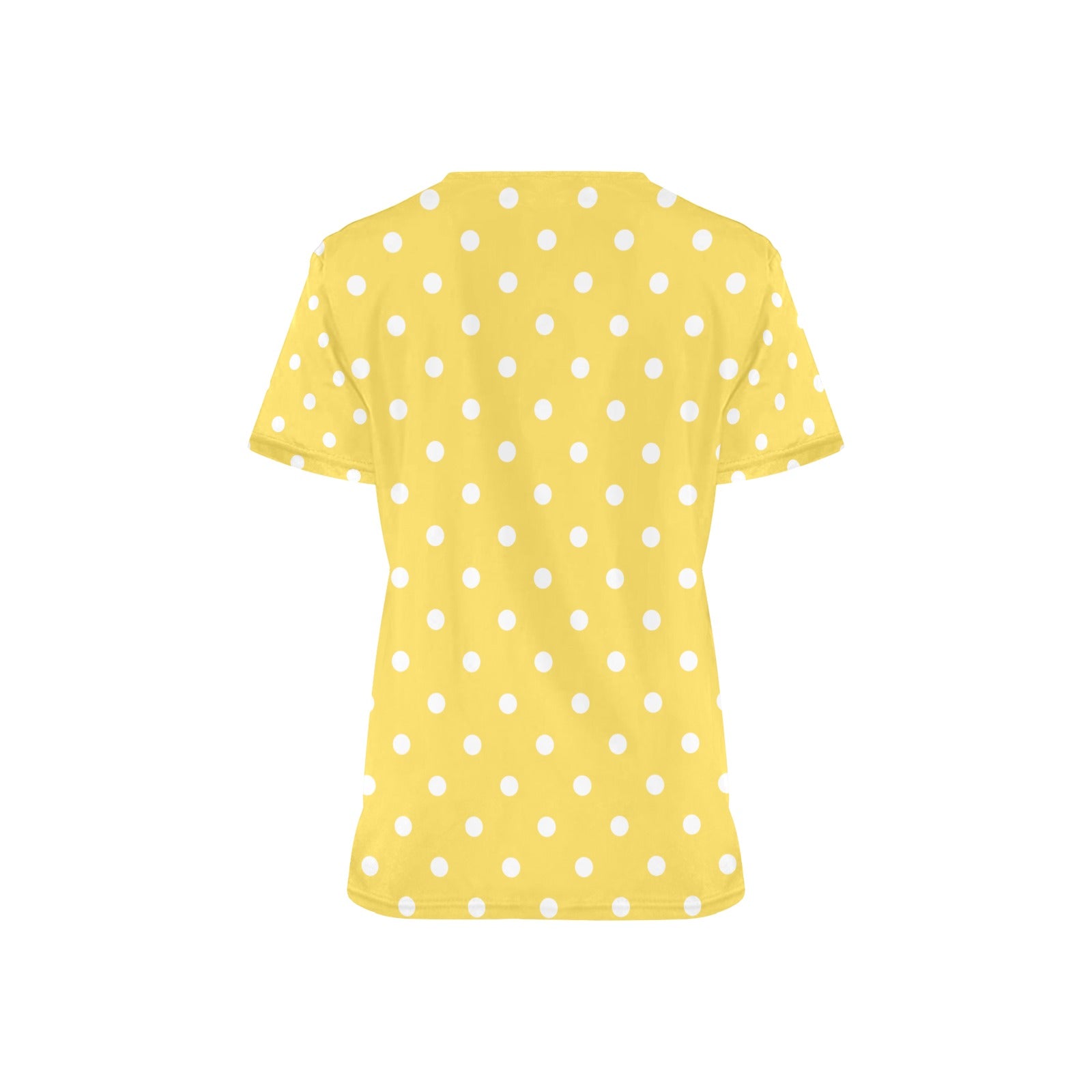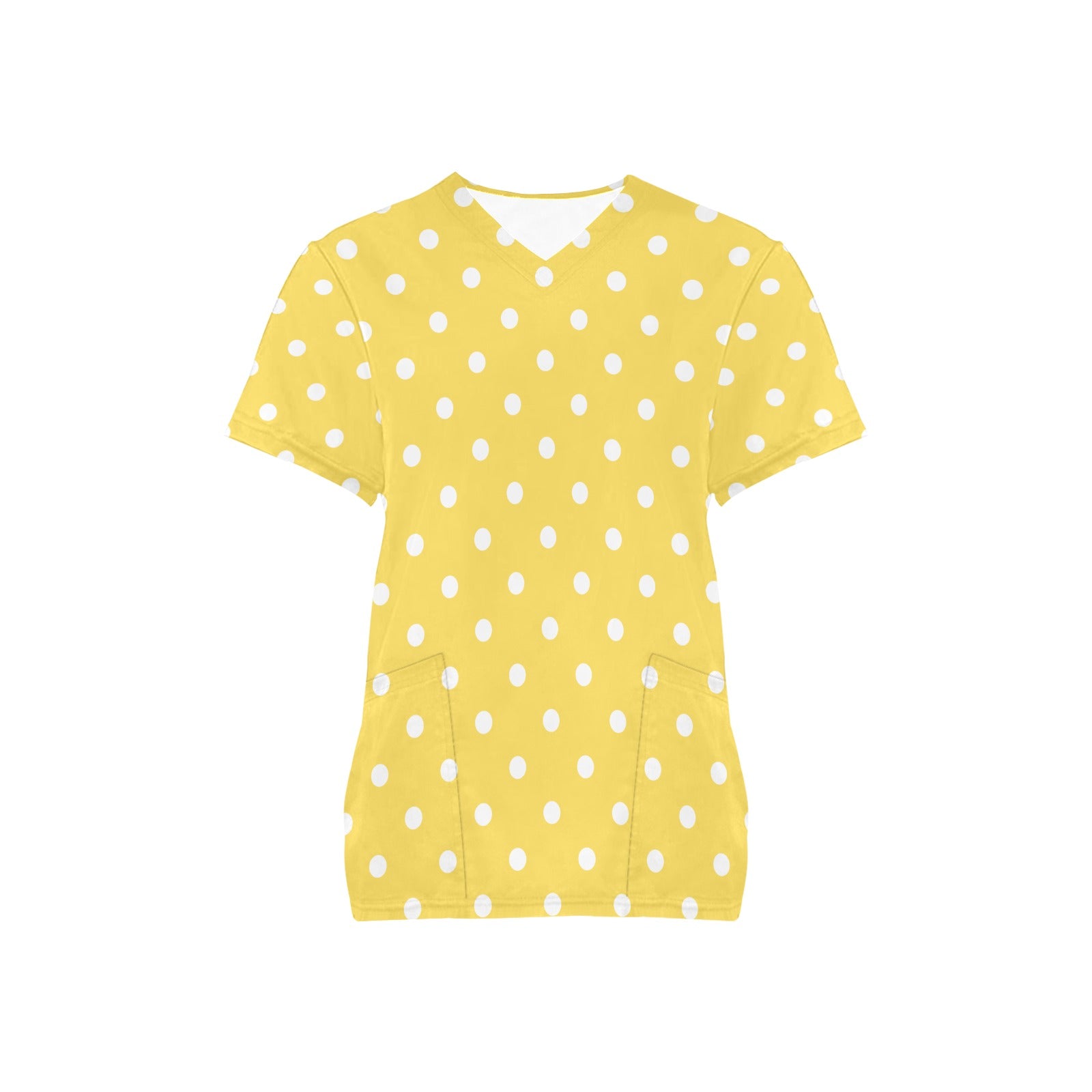 Yellow Polka Dots Medical Scrubs Top Women, Printed Ladies Female Plus Size Nursing Nurse Vet Veterinary Uniform Pockets Patterned