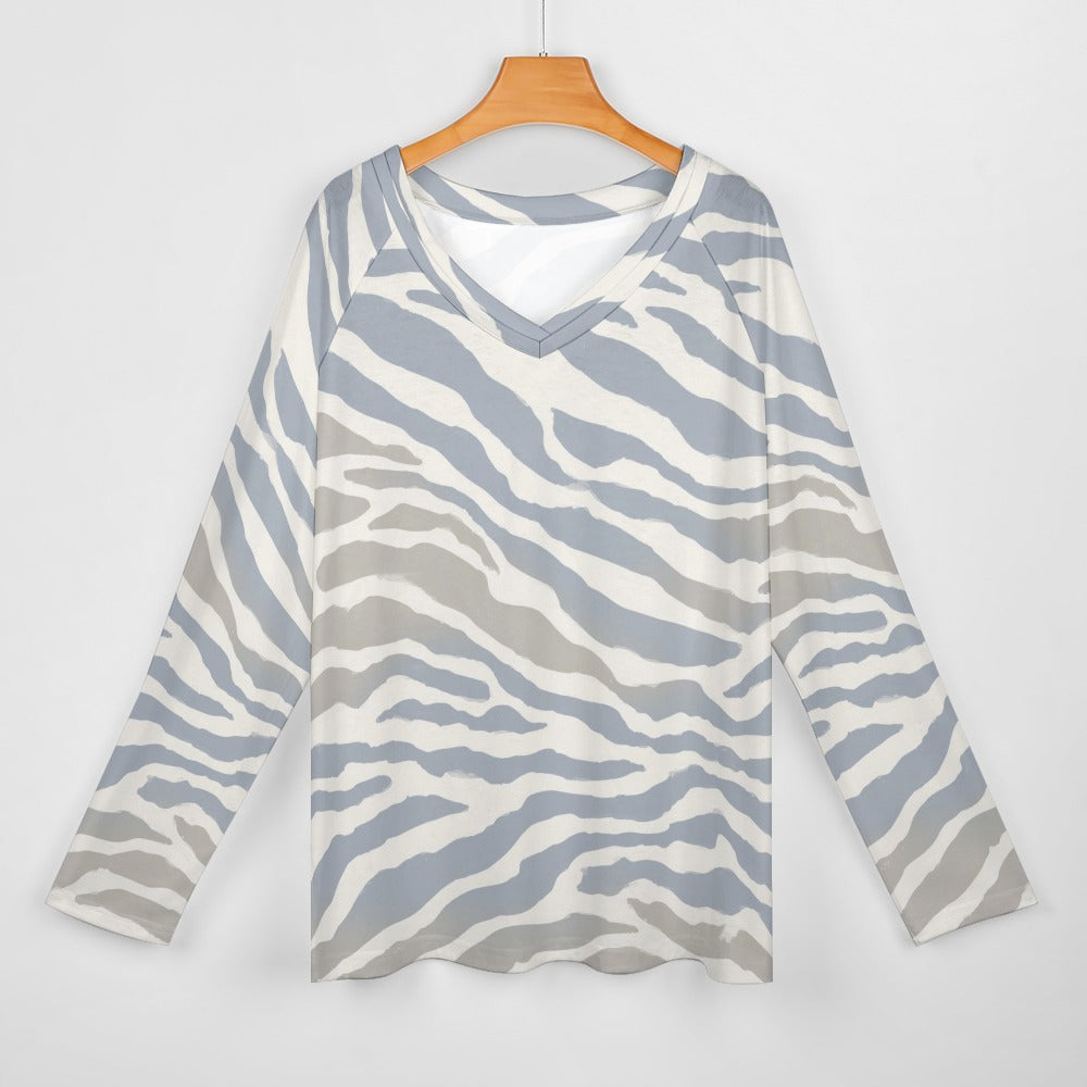 Zebra Stripe Women Long Sleeve Tshirt loose fit, Grey Blue Sand White Animal Print Relaxed V-neck Designer Ladies Female Tee Top Shirt